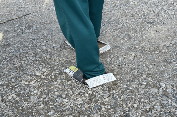 そして、ダンボールで作った中敷きの効果を試すために、実際に砂利のある場所に行って履いてみました。