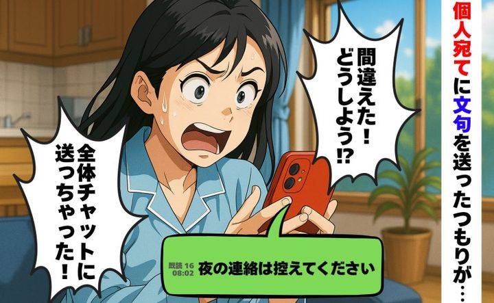 翌朝、今後は通知をオフにしようか悩んでいたところ「夜は少し控えてほしいです」と個別で LINE を送ろうとしたのですが、誤ってグループ全体に送信してしまいました。誤爆したとわかった瞬間、心臓がバクバクして顔が真っ赤になりました。