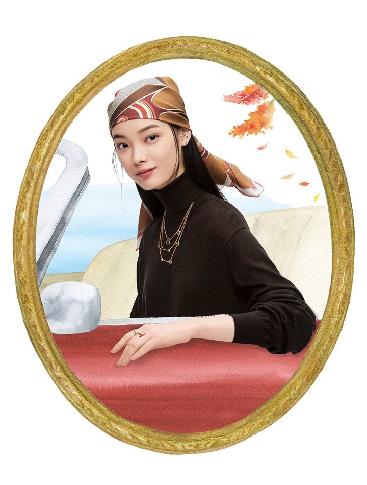雄大な自然のなかを走るオープンカーでシルクツイルのスカーフをなびかせてヘッドアレンジを楽しみたい! ハンドルを握る手元には、ピンクゴールドとダイヤモンドが煌めくジュエリーをON。