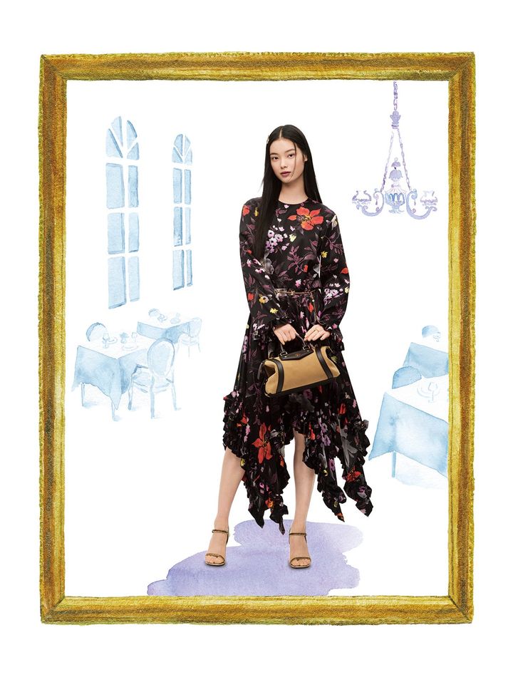 レストランでのディナーには、彩り豊かなワンピースをまとってドレスアップを。袖や裾にたっぷりのフリルをあしらったフレアワンピは、両サイドが短くなったアシンメトリーなデザイン。シルクオーガンジーならではの透け感が軽やかな印象を醸し出しています。