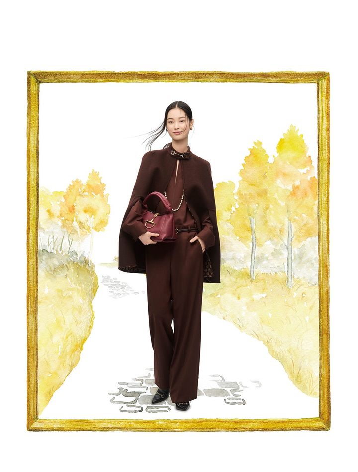 シルクウールで仕立てたダブルフェイスのケープを主役にしたオールブラウンの着こなしは、首元にあしらったホースビット ハードウェアがアクセント。ライニングのGGパターンが風に吹かれるたびにちらりとのぞくデザインです。サルトリア風のシックな装いが、軽井沢の街並みにマッチします。