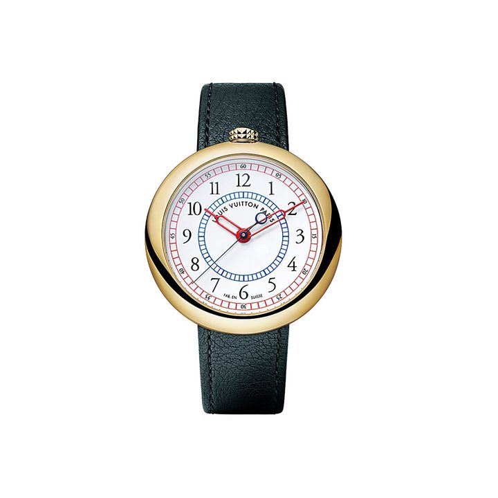 1988年に登場した初の腕時計「LV I」と「LV II」。コレクターからも多大なる人気を博してきた、建築家ガエ・アウレンティのデザインによる名品が現代によみがりました。ぺブルシェイプや12時位置のクラウンなどオリジナルの意匠を継承しつつ、現代的にアップデート。赤と青のツインスケールを配したグラン・フー エナメル文字盤も見事な意匠。