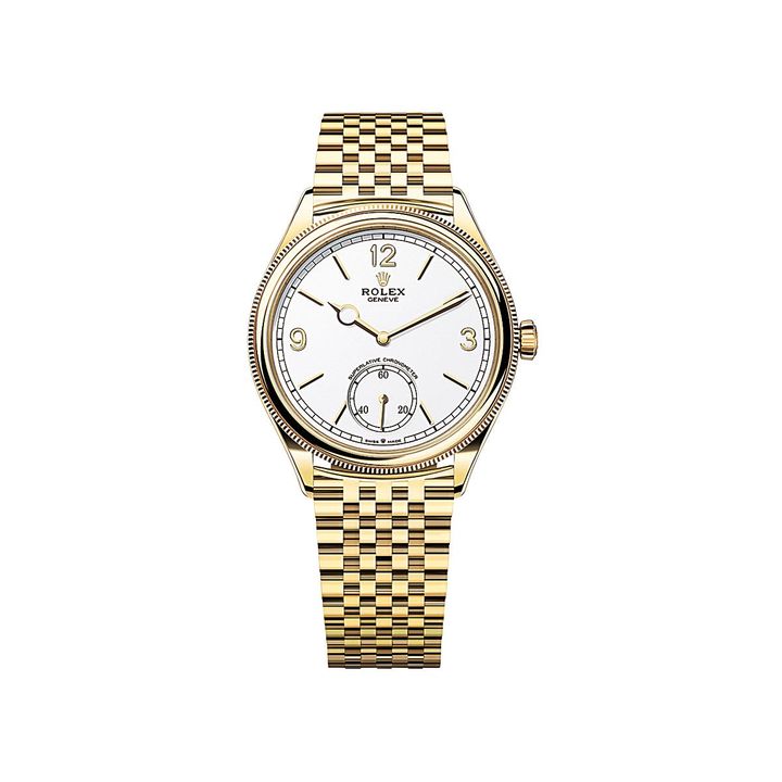 華やかなイエローゴールドの色彩とジュエリーのようにつややかな新ブレスレットが実に魅力的。まさにタイムレスな一点。時計“パーペチュアル 1908”[YGケース径39mm 自動巻き]¥ 5,273,400(Rolex/日本ロレックス) Hearst Owned