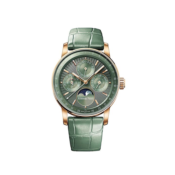 ジェンダーレスウォッチとして人気の“CODE 11.59 バイ オーデマ ピゲ”に加わったのは、直径38mmという小径サイズのパーペチュアルカレンダー。日付・曜日・月表示に加えて、うるう年の調整を自動的に行う複雑機構搭載の時計は、色彩の美しさも魅力とします。柔らかなグリーンの色調と鮮やかなピンクゴールドが優美なコントラストを描いて。