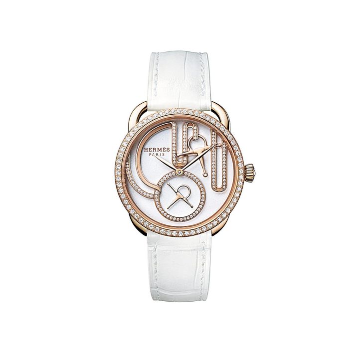 ホワイトラッカーの光沢が美しい白文字盤。時計“アルソー グラン・トゥラララ ブリッド・エ・モール”[PG×ダイヤモンド アリゲーター・マットストラップ、ケース径34mm、自動巻き]¥7,150,000(Hermès/エルメスジャポン) Hermès©Joël Von Allmen