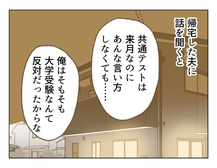 私(ミサト)は、夫のヒデキと娘のアカリとの3人暮らしです。娘は現在高校3年生! 将来の目標が決まっており、ずっと勉強を頑張ってきました。しかし来月の共通テストを前に、「受験をやめようかな」と言い出したのです。理由を聞くと、なかなか上がらない成績に焦り、つい愚痴をこぼしたところを夫に聞かれ「そんな弱音を吐くくらいなら大学なんて行くな! 働け!」と言われてしまったようで……?