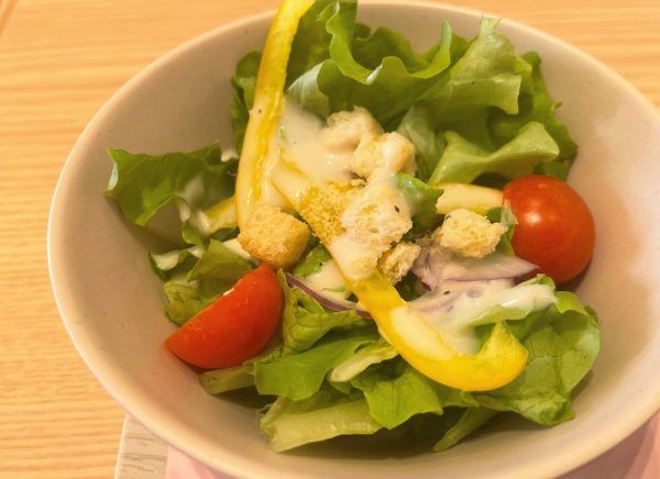 セットのサラダは彩り鮮やか。シャキッとしたレタスやパプリカがまたみずみずしくて! 素材の味そのままで、クルトンのカリッとした食感もアクセントとなり楽しくいただきました♪
