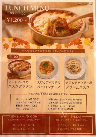 こちらはランチメニュー表です。 全てのランチにサラダとドリンクが付きます。 「えびとアボカドのペペロンチーノ」や「クラムチャウダー風クリームパスタ」などからメインを1つ選び、ドリンクはコーヒーやカフェラテのほか、+150円でイチゴのドリンクメニューが選べます。