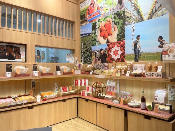 店内奥には、物販コーナーが広がっていました。 燦燦園の農園で丁寧に育てられたイチゴやサツマイモの美味しさを生かした商品がズラリ!