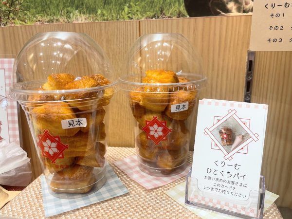 こちらは「くりーむひとくちパイ」。 付属の特性くりーむは、いちごくりーむ・生くりーむ・ティラミスくりーむの3種類から選べ、パイの中に入れても良し、付けて食べても良しだそう。想像しただけでもおいしそう~!