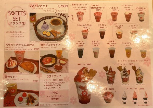 こちらはドリンク付きのスイーツセット。 「おいもセット」にはスイートポテトやミニモンブラン、干し芋ブリュレなどが付くそう。 選べるソフトクリーム付きの「いちごor おいものパイセット」もあります。