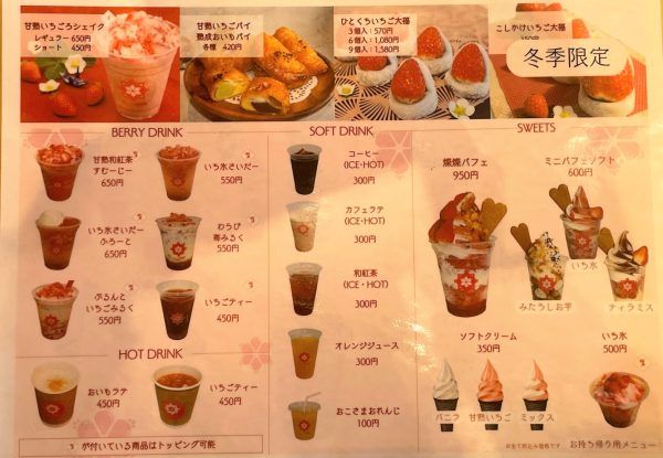 こちらはイチゴを中心とした華やかなスイーツやドリンクのメニュー。 冬季限定の「こしかけいちご大福」が気になる~! 見た目も可愛いイチゴの「燦燦パフェ」も美味しそう!