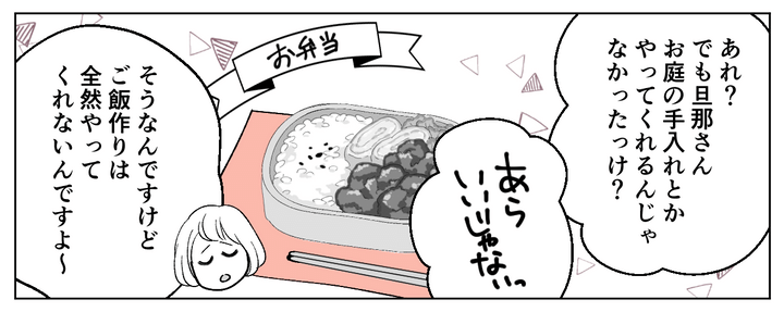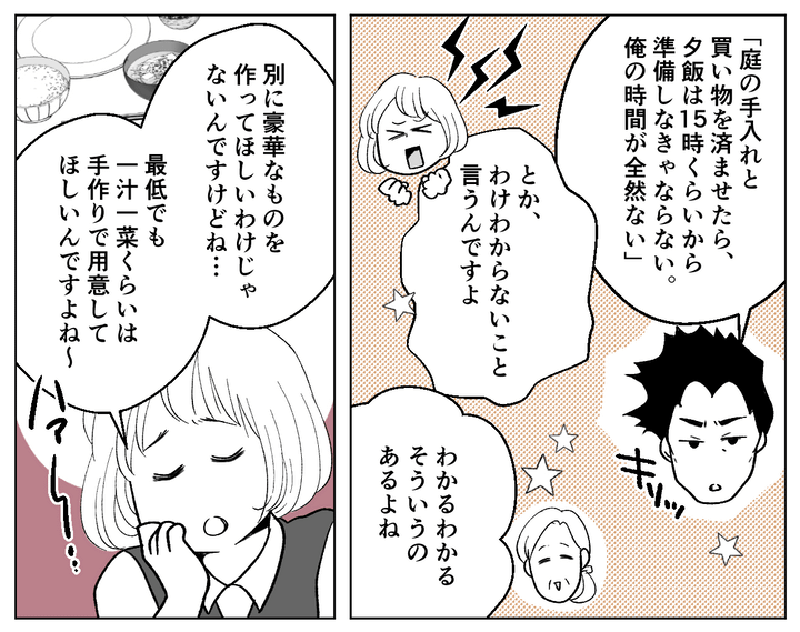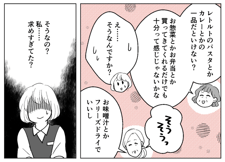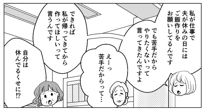 しかし私が「夫が休みの日くらいは、手作りで一汁一菜を用意してほしい」と思っていることを言うと、パート仲間たちは驚愕。「レトルトや惣菜で十分だ」「作ってもらえるだけでありがたい」と言われました。