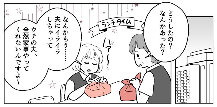 翌日は夫婦ともに仕事。私はパート仲間2人と一緒にお昼ご飯を食べます。ため息をつく私に「なんかあった?」と聞いてくれたパート仲間に、夫が家事をしてくれないことをグチりました。