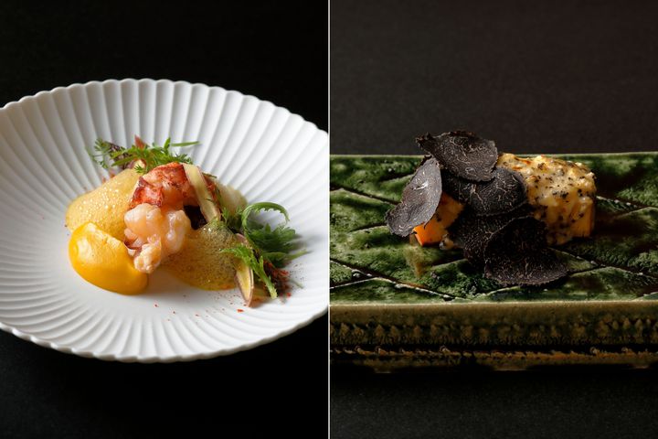 東山から望む京都の景色と料理のマリアージュを満喫できる、パーク ハイアット 京都のシグネチャーレストラン「八坂」。料理長の小山健太郎氏が、味わい深い京都の食材にフレンチのエスプリを効かせたフェスティブディナーコースがお目見えします。自家製ブリオッシュにモンドールチーズと黒トリュフを重ねたクロックムッシュ(写真右)、ロブスタービスクに金時にんじんと春菊を合わせた一皿(写真左)など、驚きと感動を味わえるメニューを提供。メインには、ユニークなコンディメントで国産黒毛和牛テンダーロインを。締めくくりの炊き込みごはんや、苺に薔薇が香る可憐なデザートまで、この時期ならではの香りと味わいが織りなす、特別なコースで心温まるひとときを過ごしてください。