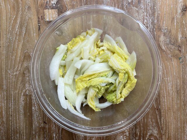 ① 白菜は1cm幅にカットして耐熱容器に入れ、ふんわりラップをかけて、600Wのレンジで4分加熱してそのまま冷まし、粗熱が取れたら水分を絞ります。