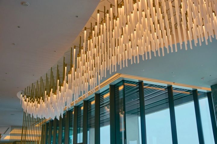 流線型のシャンデリアは、港が近い横浜にちなみ、波をイメージ