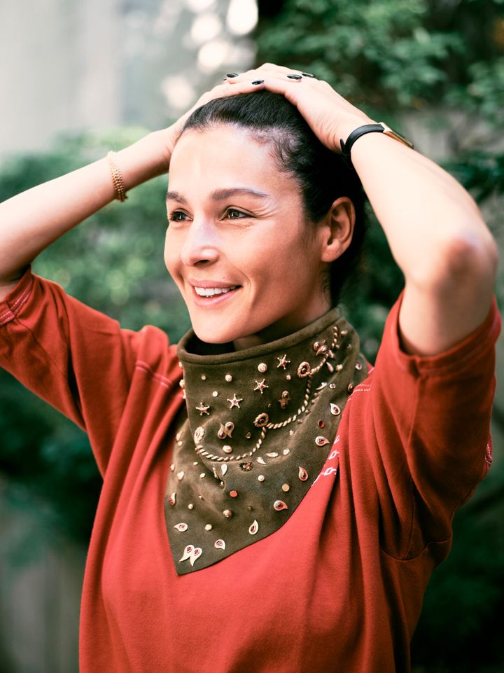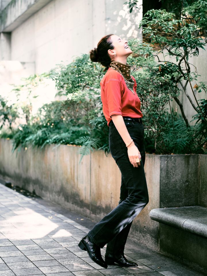 この日のコーデは、「マリー リシュテンベルグ」のジュエリースタッズ付きスカーフを主役に、ヴィンテージのトップスと「サンローラン」のブラックデニムというカジュアルながら洗練されたスタイル。足もととベルトには、フランスのテーラーブランド「ハズバンズ(HUSBANDS)」を合わせ、マスキュリンなムードに。