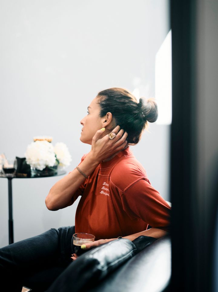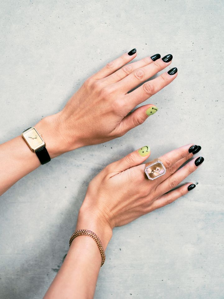 ジュエリーはすべて「マリー リシュテンベルグ」。この日は存在感のある大ぶりのピースを選び、「コルム(CORUM)」の美しい時計で静かに気品を添えていた。さらに、遊び心のあるスマイルマークのネイルが、気負わない雰囲気と上質さのバランスをほどよく演出。普段は重ねづけのスタイリングもよく楽しんでいるそう!
