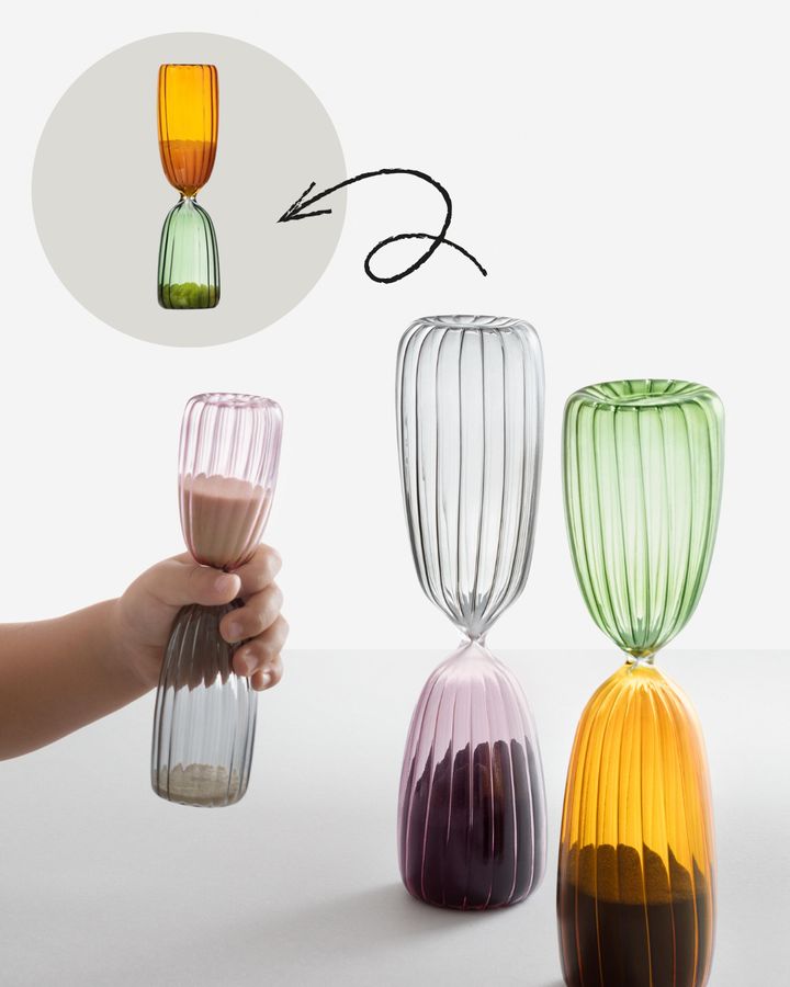 色バリエーションは、スモーク×ピンク、アンバー×スモーク、グリーン×アンバーの3種類。絶妙な配色はオブジェとしても楽しめる。砂時計という究極にアナログな機能が、ものづくりの本質を見つめ直すきっかけを与えてくれる逸品。