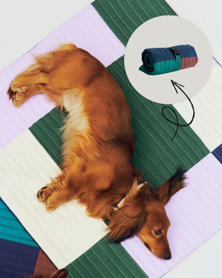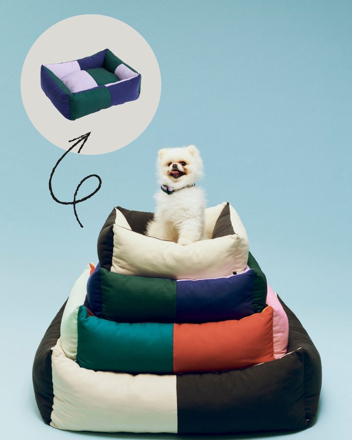 ドッグベッドは遊び心のあるカラーブロッキングのデザインが特徴で、耐久性に優れたリサイクルポリエステルを使用。中綿のクッションにもリサイクルポリエステルを採用。取外して洗えるので清潔に保つことができる。