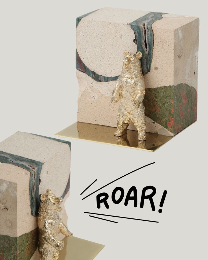鉱石と樹脂をコンビネーションしたベースに、遊び心あふれる真鍮の熊を組み合わせたブックエンドは、アートピースのような存在感で蔵書を見守ってくれる。