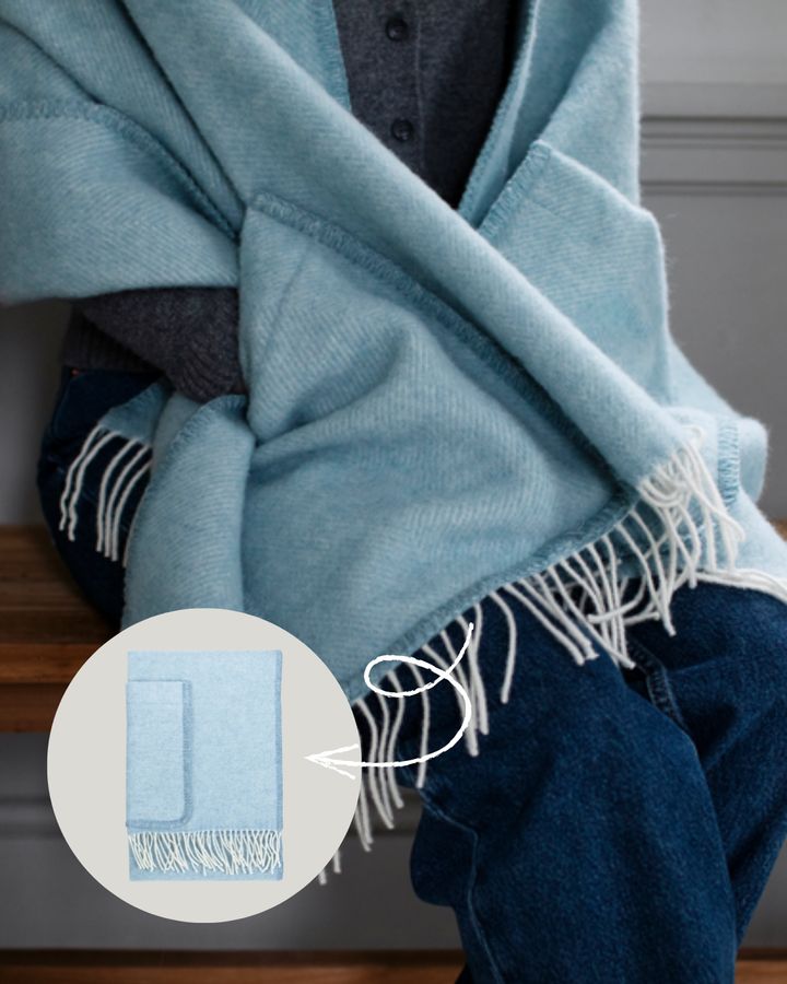 エル・デコ ショップでも人気のポケットショールは、地元のフィンシープのウールを使用して生産されている。ポケットに鍵とスマホと財布を入れて部屋着の上にさっと羽織れば外出できるような、スタイルアップアイテムとしても注目したい。車やオフィスに常備しておくのもおススメ。