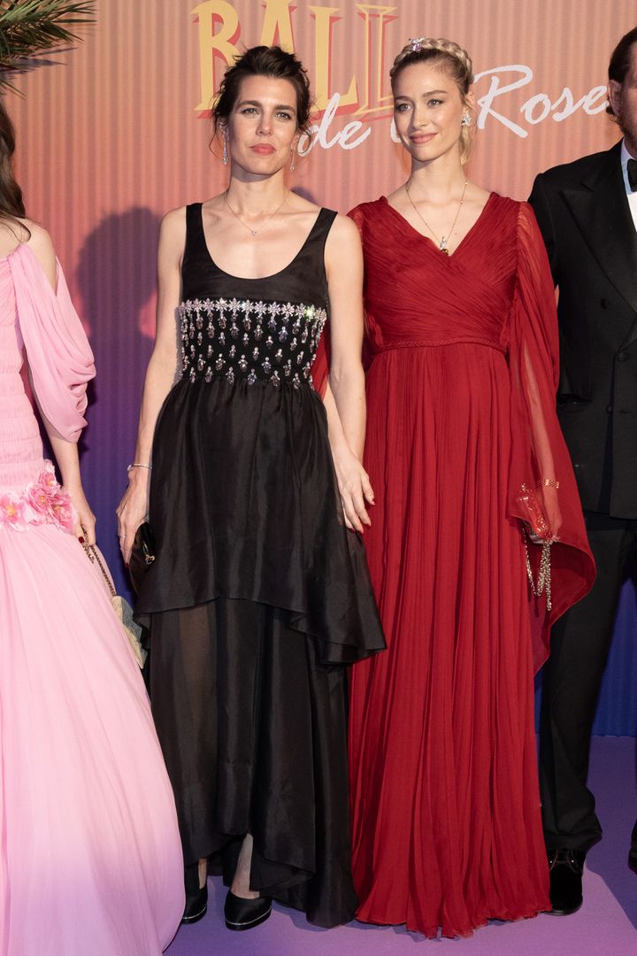 モナコ公室の中でもひときわ高いファッションセンスを誇るシャルロット・カシラギ(左)とベアトリーチェ・ボロメオ(右)の義姉妹。オールブラックでミニマル・シックを極めたシャルロットとは対照的に、ベアトリーチェ・ボロメオは、「サンセット」を体現するかのような情熱的なレッドをチョイス。