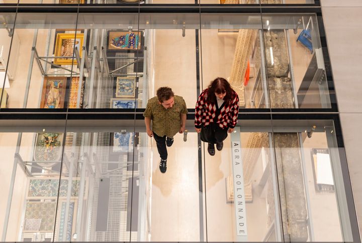 <写真>ウェストン・コレクションズ・ホールの床の一部はガラス張りになっており、17世紀のムガル建築のアグラ城浴室のアグラ列柱など、下階に置かれた所蔵品を見下ろして鑑賞することができる。