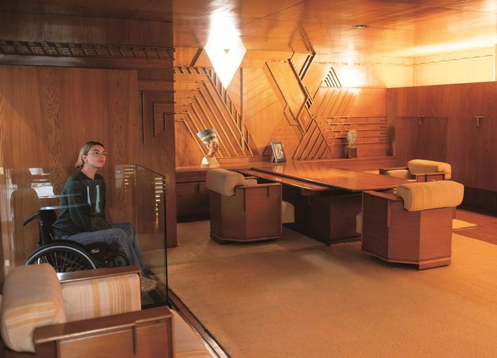 「カウフマンズ・オフィス」は1937年にフランク・ロイド・ライトがアメリカの百貨店経営者エドガー・J・カウフマンの依頼を受けて設計したもの。ライトが手掛けたインテリアがほぼ完全な形で残る、アメリカ国外では稀有な常設展示である。