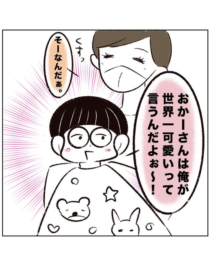「おかーさんは、俺が世界一かわいいって言うんだよぉ~!」と得意げに話すアキくん。美容師さんは思わずクスッと微笑み「そーなんだぁ」と返しました。