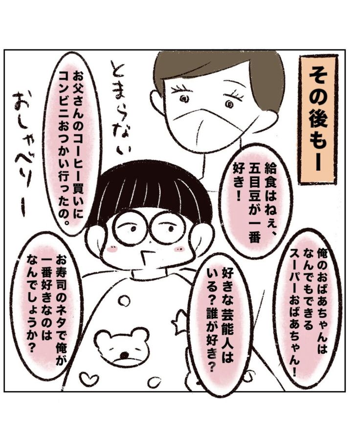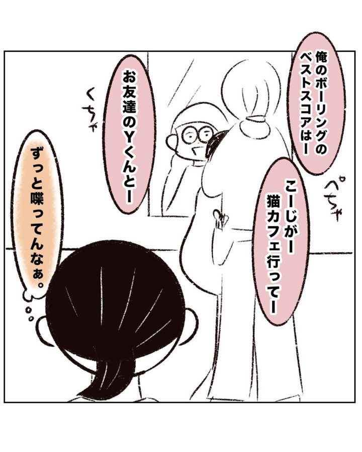 「俺のボーリングのベストスコアは~」「こーじが猫カフェ行って~」「お友達のYくんと~」休むことなくおしゃべりを続けるアキくん。その背中を、まるさんは「ずっと喋ってんなぁ」と静かに見守っていました。