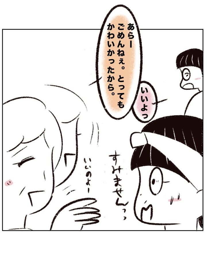 お客さんは状況がつかめないまま、「ごめんねぇ、とってもかわいかったから」と優しく謝罪。するとアキくんは「いいよっ」とあっさり許します。まるさんは褒めてくれたお客さんに、すみませんとお詫びを伝えました。