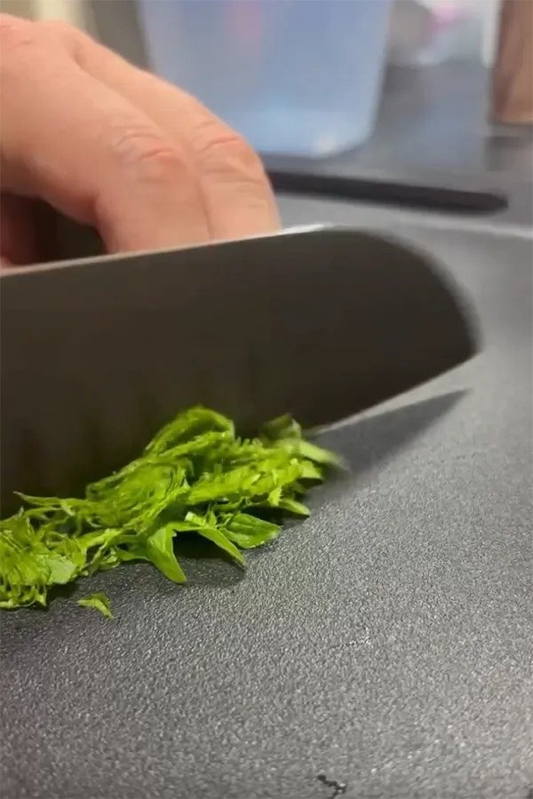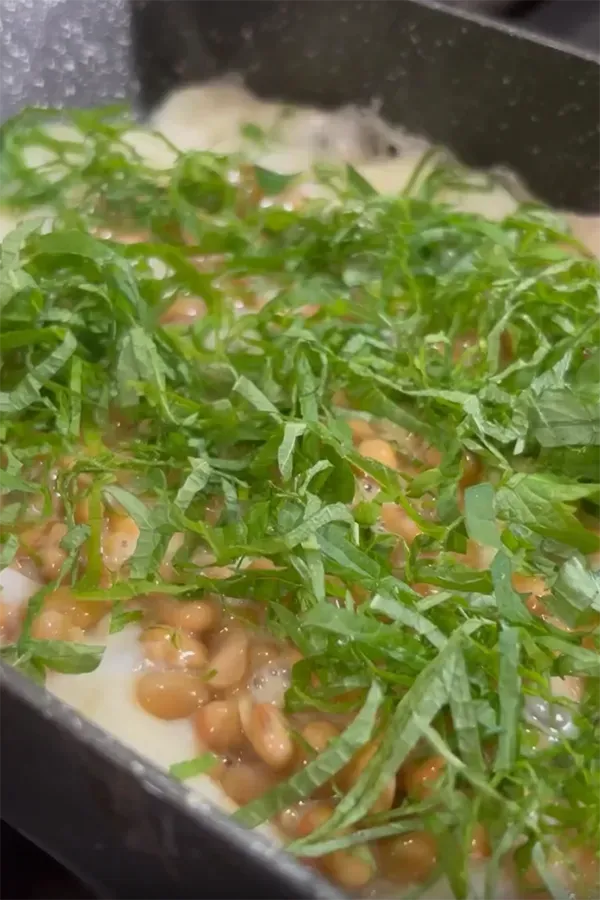 納豆を全体に広げ、刻んだ大葉をのせてください。