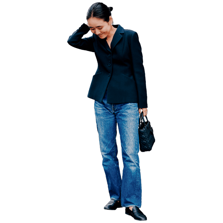 「本来はこんな風にデニムに合わせてローファーをはくことが多い」という綾さん。デニム×黒いジャケット×ローファーは鉄板ですが「今季はそれもちょっとレディに、が気分」と、ウエストシェイプされたシルエットが美しいジャケットをチョイス。エレガントなフェミニンさが大人の品格を引き立てる! Dhyana.のローファー、COUDREのパールのピアス、Diorのジャケット、バッグ、LEVI’S®のヴィンテージデニムは全て本人私物