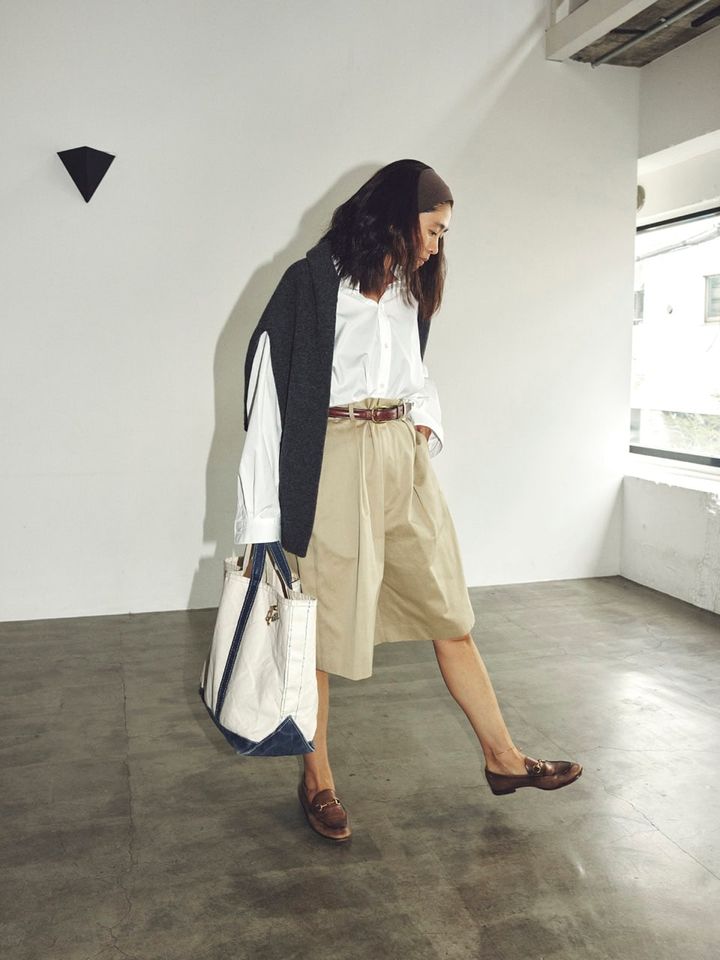 GUCCIのホースビットローファー、Graphpaperのシャツ、MIU MIUのカーディガン、L.L.Beanのトート、ROKUのベルト、ヘアバンド、アンクレットは全て本人私物