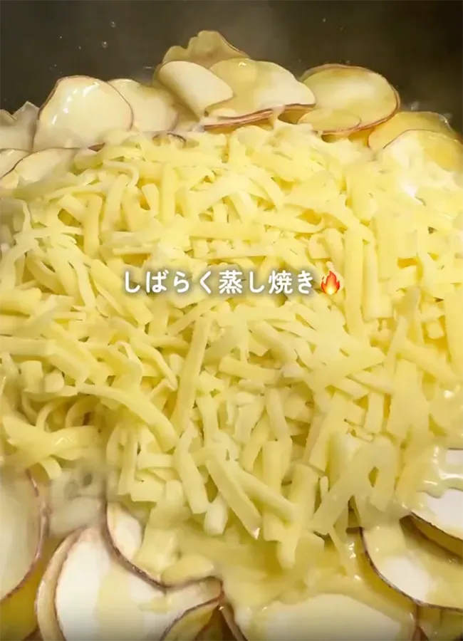 中央にチーズをのせたら、フライパンの端に水を回しかけて蓋をし、しばらく蒸し焼きにしましょう。