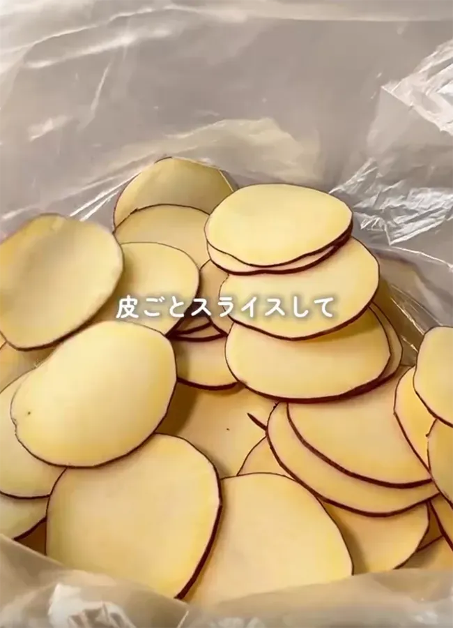 食品用のビニール袋に、スライスしたサツマイモと片栗粉を入れたら、シャカシャカと振るように混ぜてください。