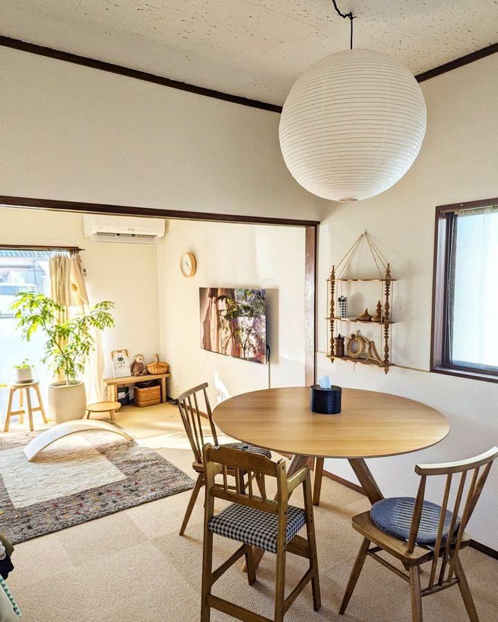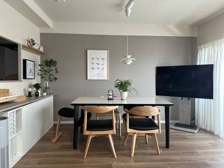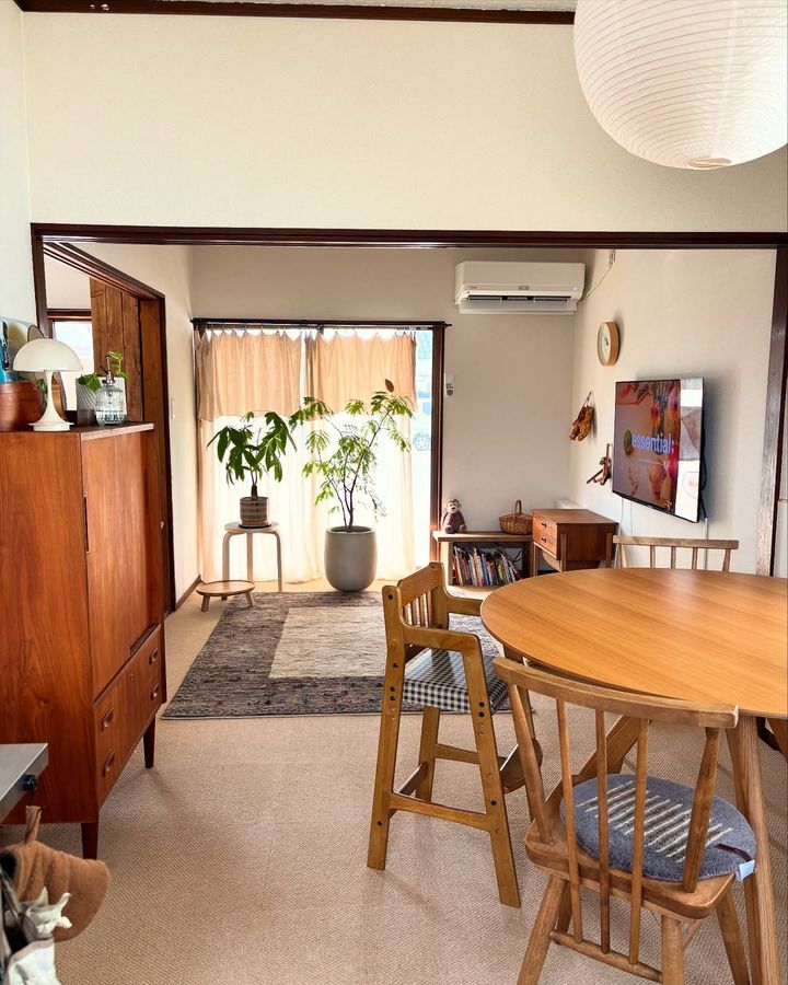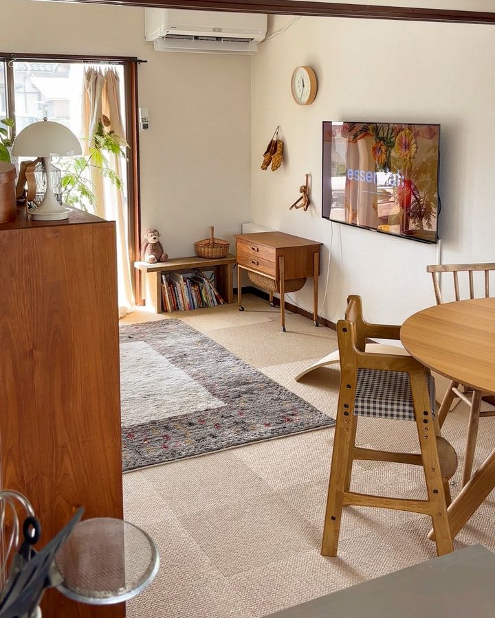 築古の戸建てで気になるのが、冬の寒さ。kinaさんは対策として、リビングダイニングの床にファブリックのタイルカーペットを敷くことで冷気をシャットアウト。テレビは壁掛けにすることで広さを確保し、観葉植物や背の高いキャビネットも組み合わせることでうまく視線の集まるポイントをつくっていらっしゃいます。