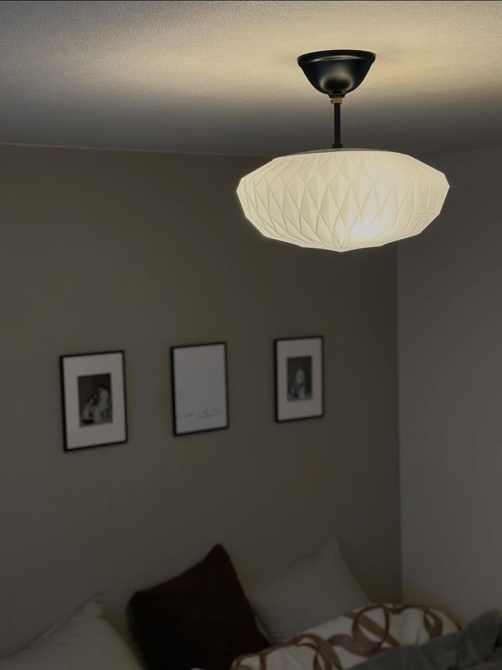 ガラス製のシェードで存在感あるおしゃれなライトは、シーリングカップが大きく、築古賃貸の黄ばんだ配線器具をすっぽり隠してくれるところもポイントなんだそう。