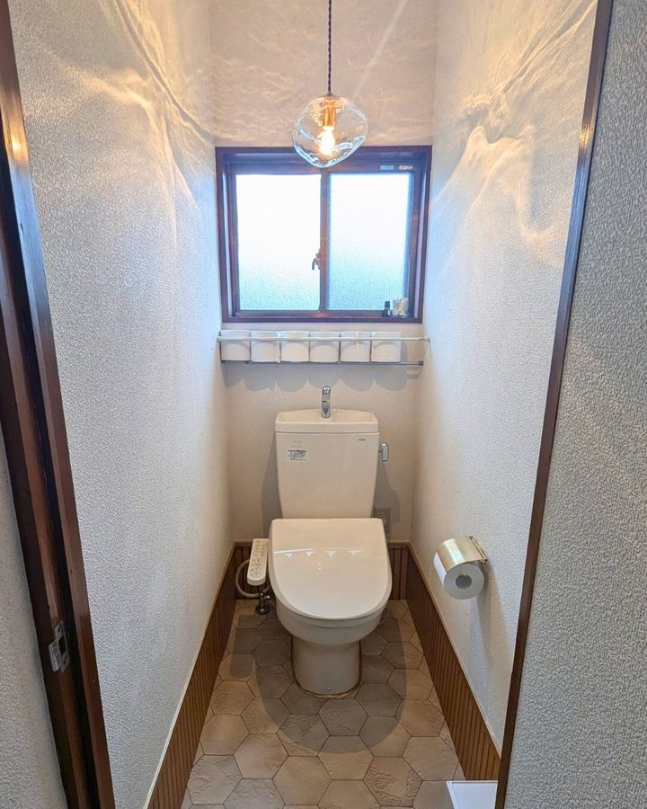 昔ながらのレトロなタイルが残っていたトイレは、タイル部分にEASY WALL TAPEを貼り、床にはフロアシートを敷いてイメージをがらりと変えられています。ペーパーホルダーや、見切り材の部分もゴールドに変えられて、ホテルライクな雰囲気に。