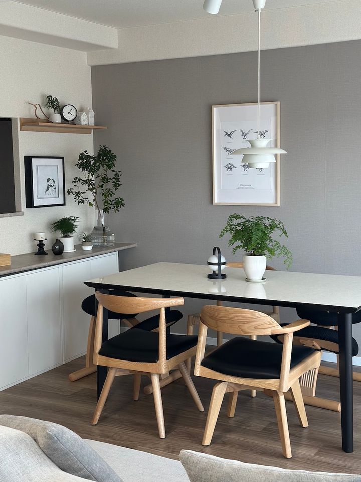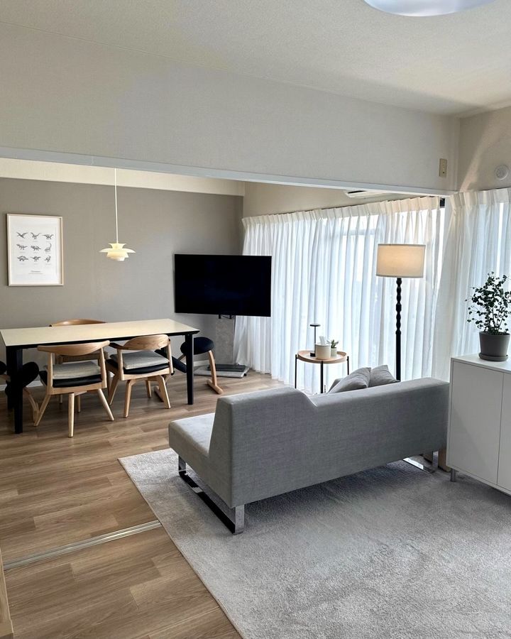 白い天板のダイニングテーブル、背もたれが高くないソファを選ぶなど、部屋を明るく広く見せる家具選びの工夫もあります。天井があまり高くない賃貸マンションでも心地よい空間をつくるには、木の家具を置きすぎると、カジュアル、チープな印象になってしまうことがあるため、ウッドの分量を増やしすぎず、白、黒、グレーなどモノトーンをうまく取り入れるようにされているそう。テーブルは大川家具、ソファはFLANNEL SOFAのもの。