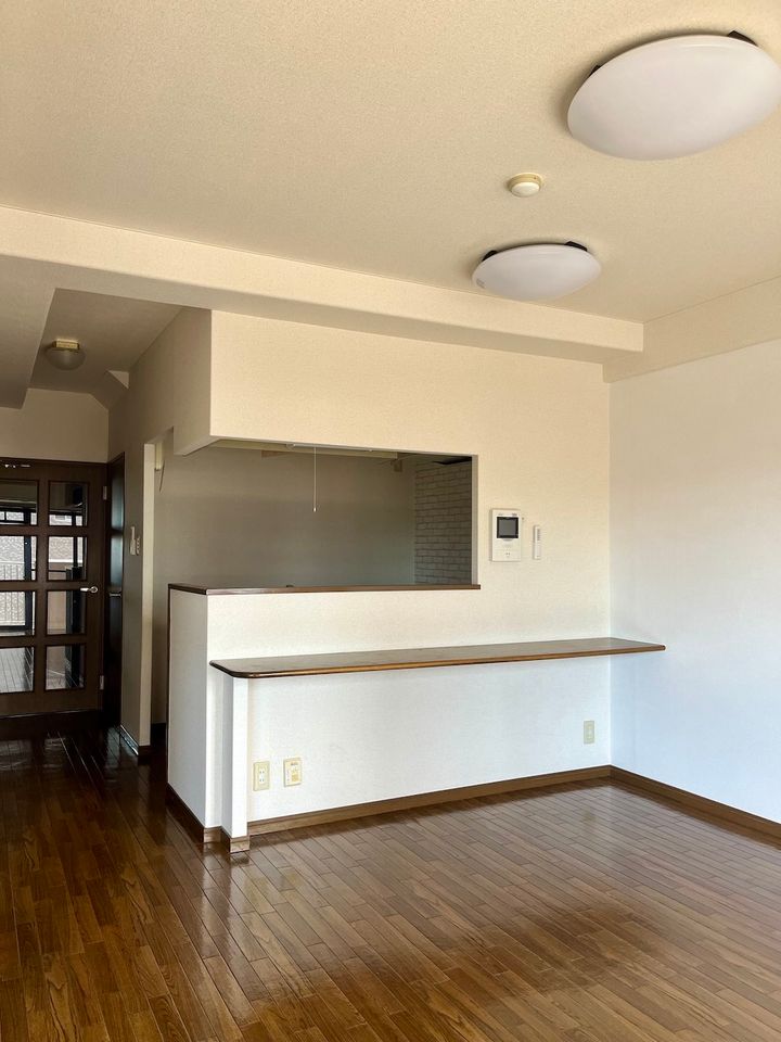 こちらがビフォアの状態。床や幅木、ドア、つくりつけのカウンターテーブルはミドルブラウンで、綺麗なお部屋ですが築年数相応の古めかしさがあります。