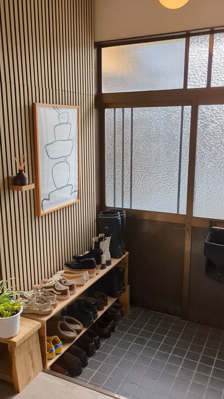 玄関の壁にはマックスシェアーの吸音ウッドパネルを貼り、下駄箱がなかったため靴用のシェルフをDIY。