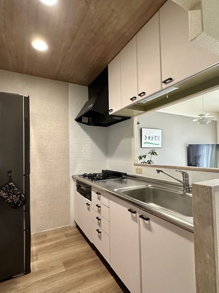 キッチンは備え付けの戸棚に貼ってはがせるリメイクシートを貼り、壁にはタイルシールを。