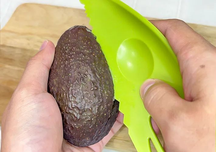 アボカドの皮は、ギザギザとした形で硬く、包丁だと滑りやすくて危険ですが、『アボカドカッター』ならサクッと切ることができます。