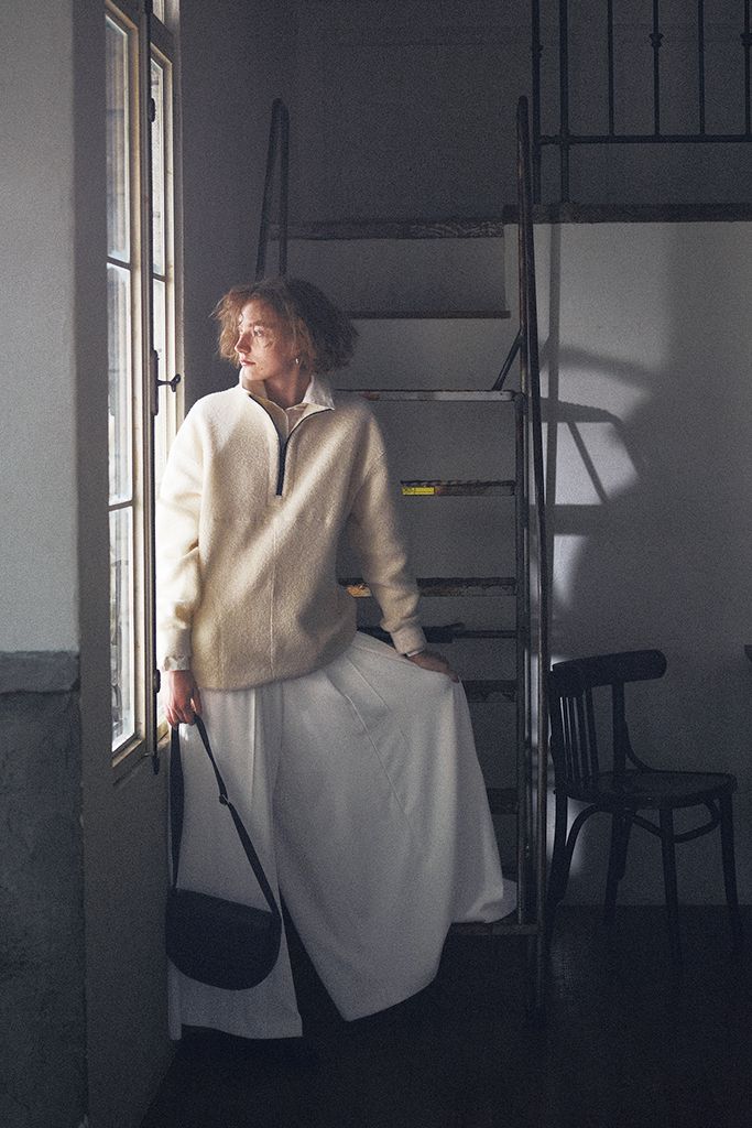 肌をすべるような、つるんとしたテクスチャー。ニュアンスがつくシルエットで、クリーンな白パンツを身近な存在に。フリースやシャツなど異素材を組み合わせて、ワントーンスタイルにメリハリづけ。