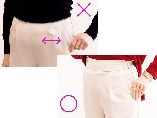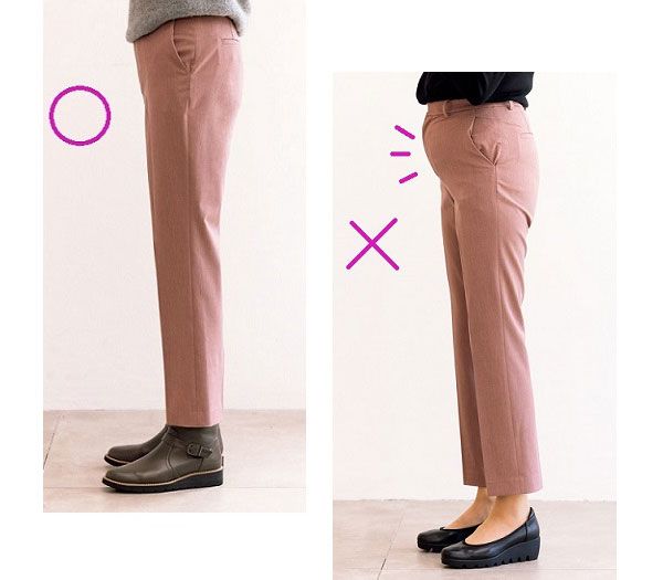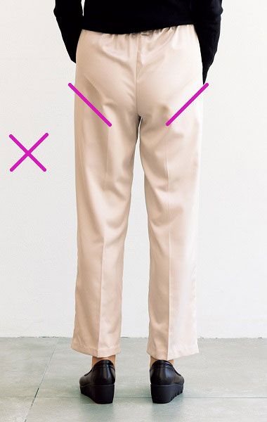ウエストに合わせてパンツを選ぶとお尻まわりにゆとりがなく、下着のラインがパンツに響いたり、お尻のお肉の段々があらわになることも。パンツを試着する際は大きいサイズも試し、お尻や太ももにゆとりのある、後ろ姿がスッキリ見える1本を選びましょう。