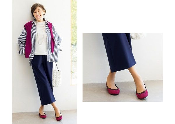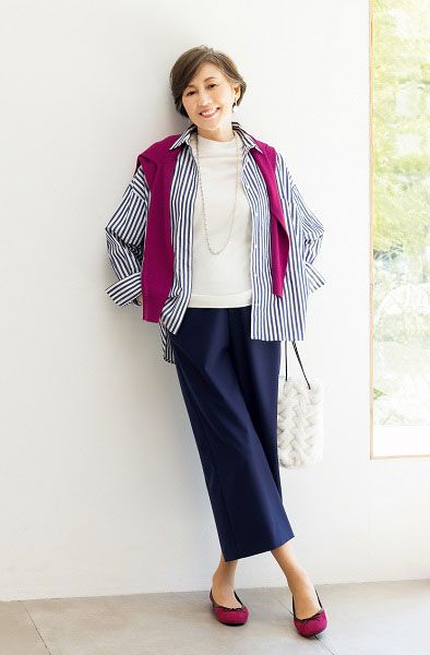 下半身はまっすぐの脚のライン、上半身はストライプ柄のシャツと肩にかけたカットソーにより、縦のラインが強調され全体的にほっそり見えます。「足首を出すと軽やかな着こなしに」と岡部さん。