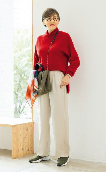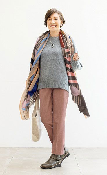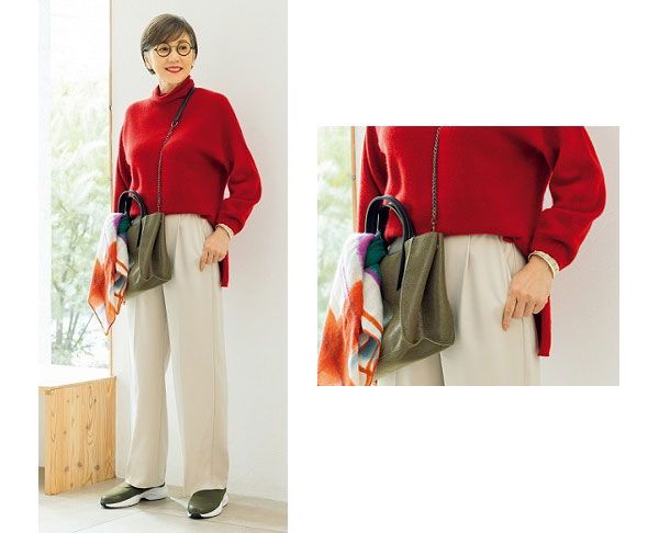 「スッキリしたシルエットのパンツなので、ボリュームのあるトップスとの相性が◎です」と岡部さん。ふんわりしたニットや大きめストールを合わせると、脚のスリムさが強調されバランスのいいコーディネートになります。
